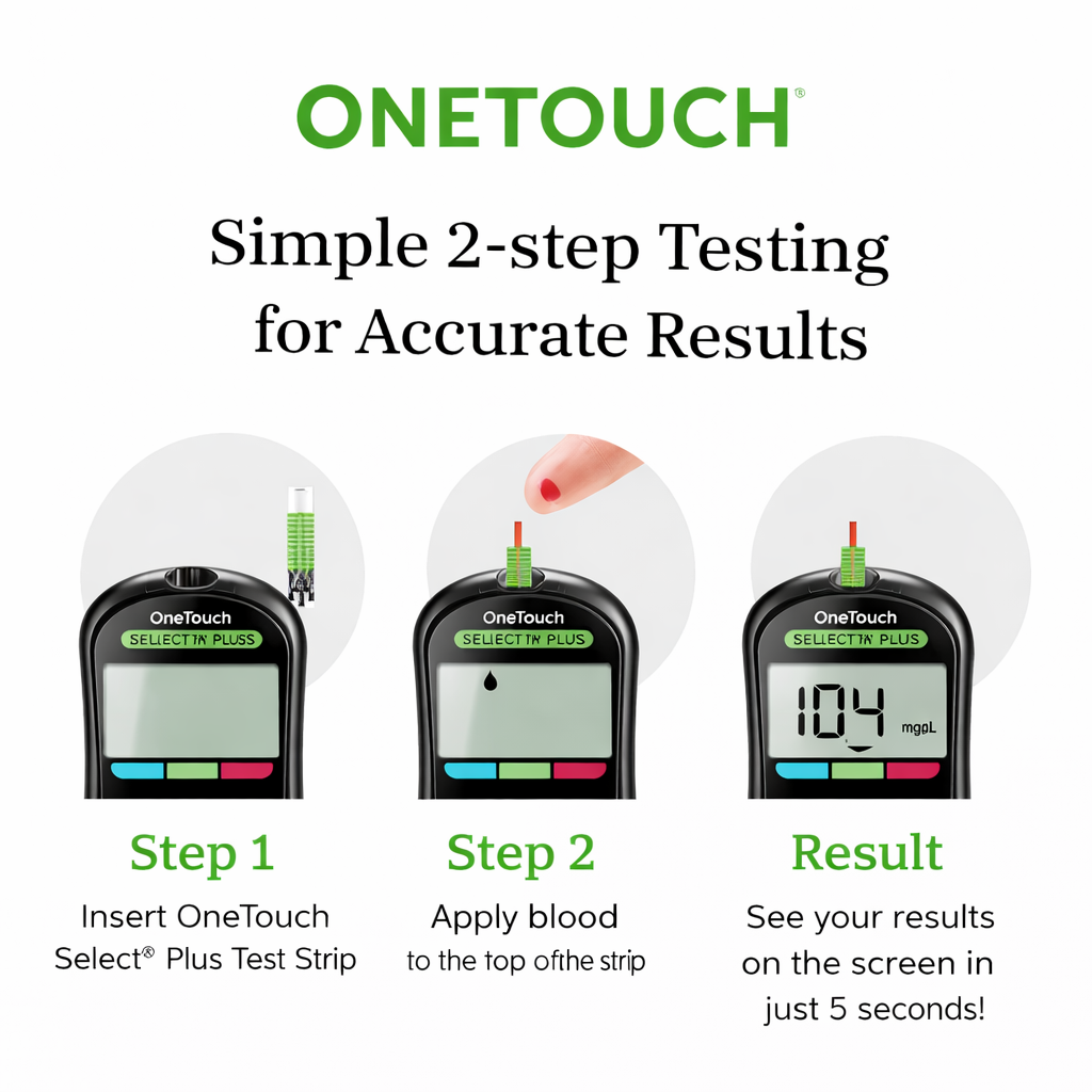 OneTouch Select Plus Simple Blood Glucose Meter is designed to deliver fast, accurate, and reliable blood glucose testing to support effective daily diabetes management. Built with innovative ColourSure® technology, it helps users instantly understand their blood sugar levels through clear color indicators, reducing confusion and improving confidence in results. The meter requires no buttons, setup, or coding, making it extremely easy to use for all age groups, including first-time users and elderly patients. Its large, easy-to-read digital display ensures results are visible within seconds, allowing for quick decision-making. Compact and portable, the OneTouch Select Plus Simple® Meter is ideal for regular home use and on-the-go monitoring. Compatible with OneTouch Select Plus test strips, it offers consistent performance and trusted accuracy, supporting simple, stress-free blood sugar monitoring as part of a healthy diabetes care routine.