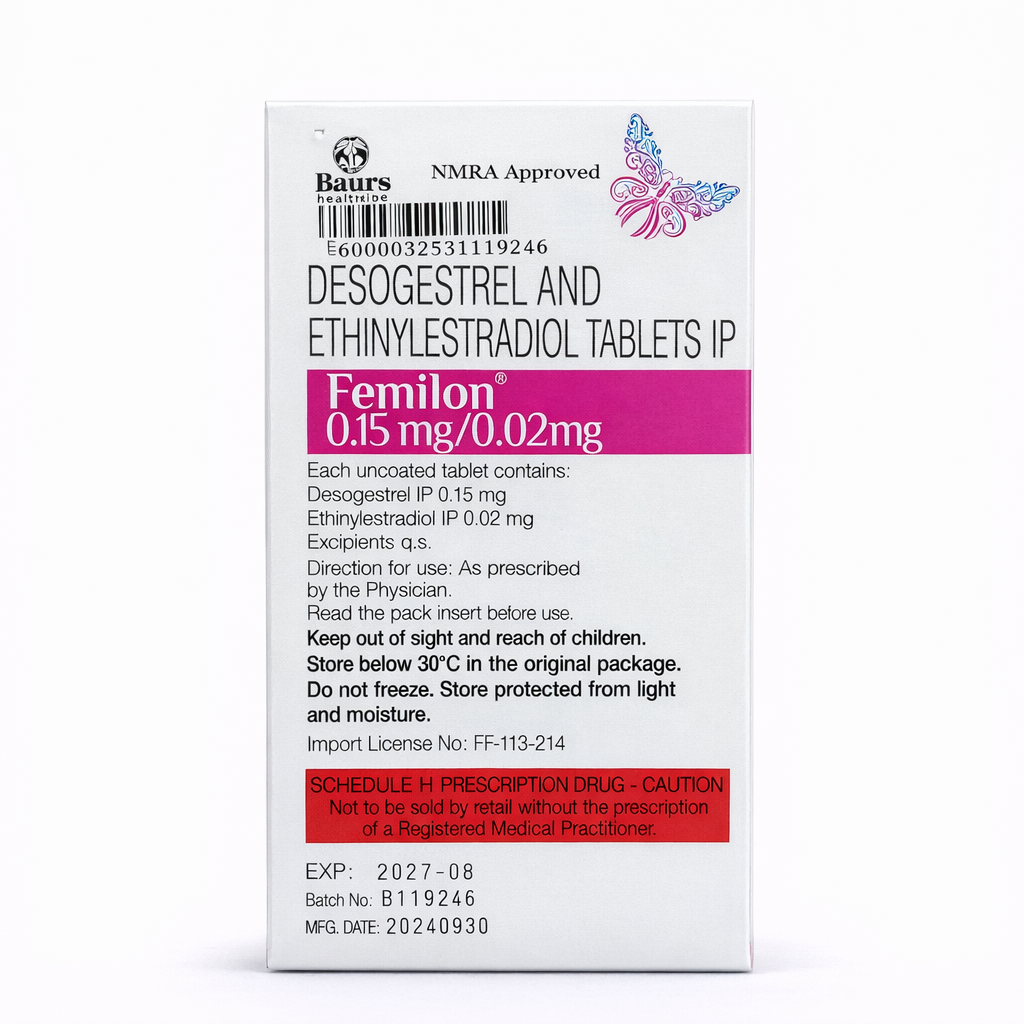 Femilon Tablet for Reliable Birth Control is a prescription oral contraceptive tablet containing a combination of desogestrel and ethinylestradiol, commonly used as part of planned family planning under medical supervision. It is supplied as a 21-tablet regimen for oral use and is manufactured according to approved pharmaceutical quality standards.