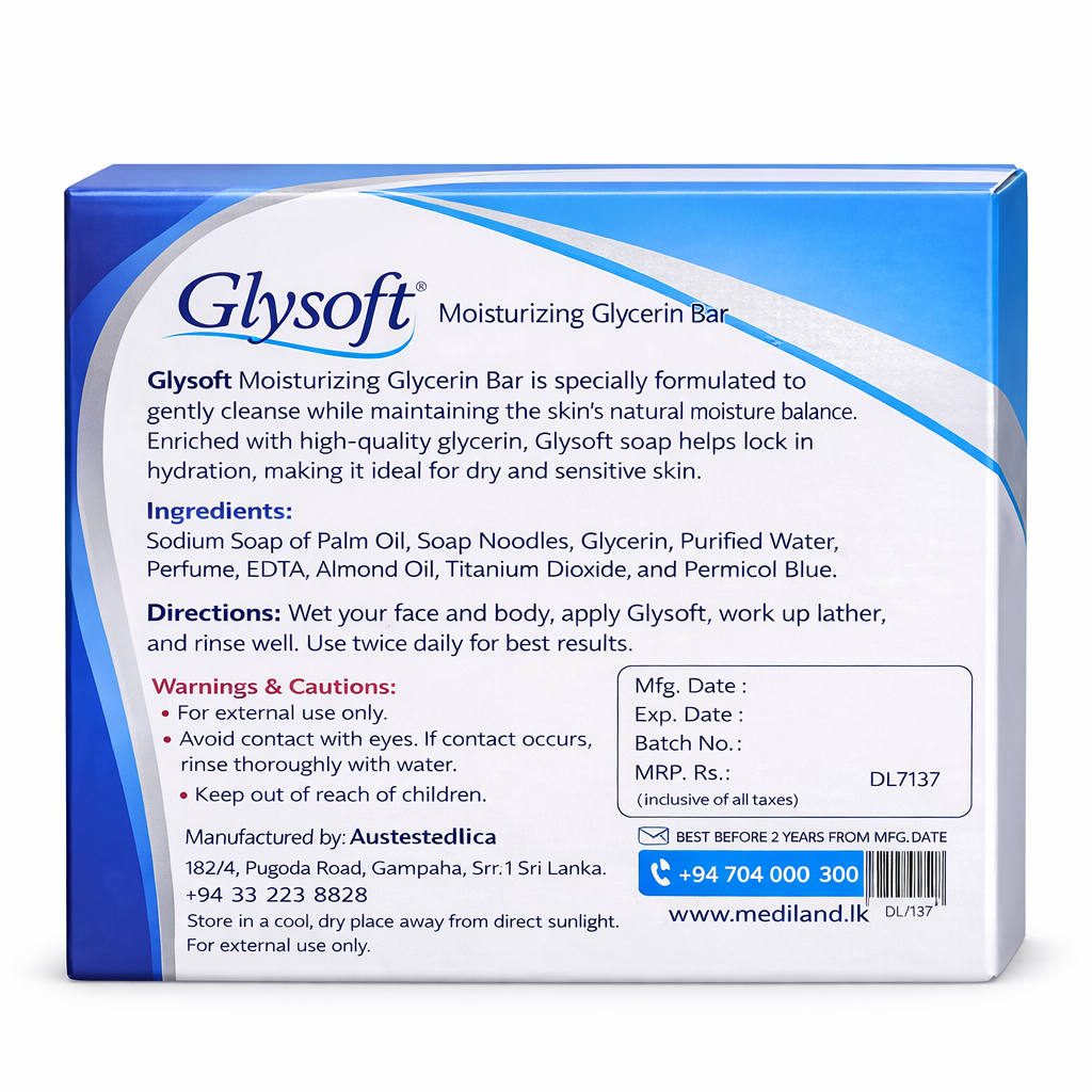 Its mild, skin-friendly formula cleanses without stripping away essential oils, leaving your skin soft, smooth, and refreshed after every wash. Suitable for all skin types, Glysoft glycerin bar is perfect for face and body use, bath and hand washing, and everyday family skincare needs.