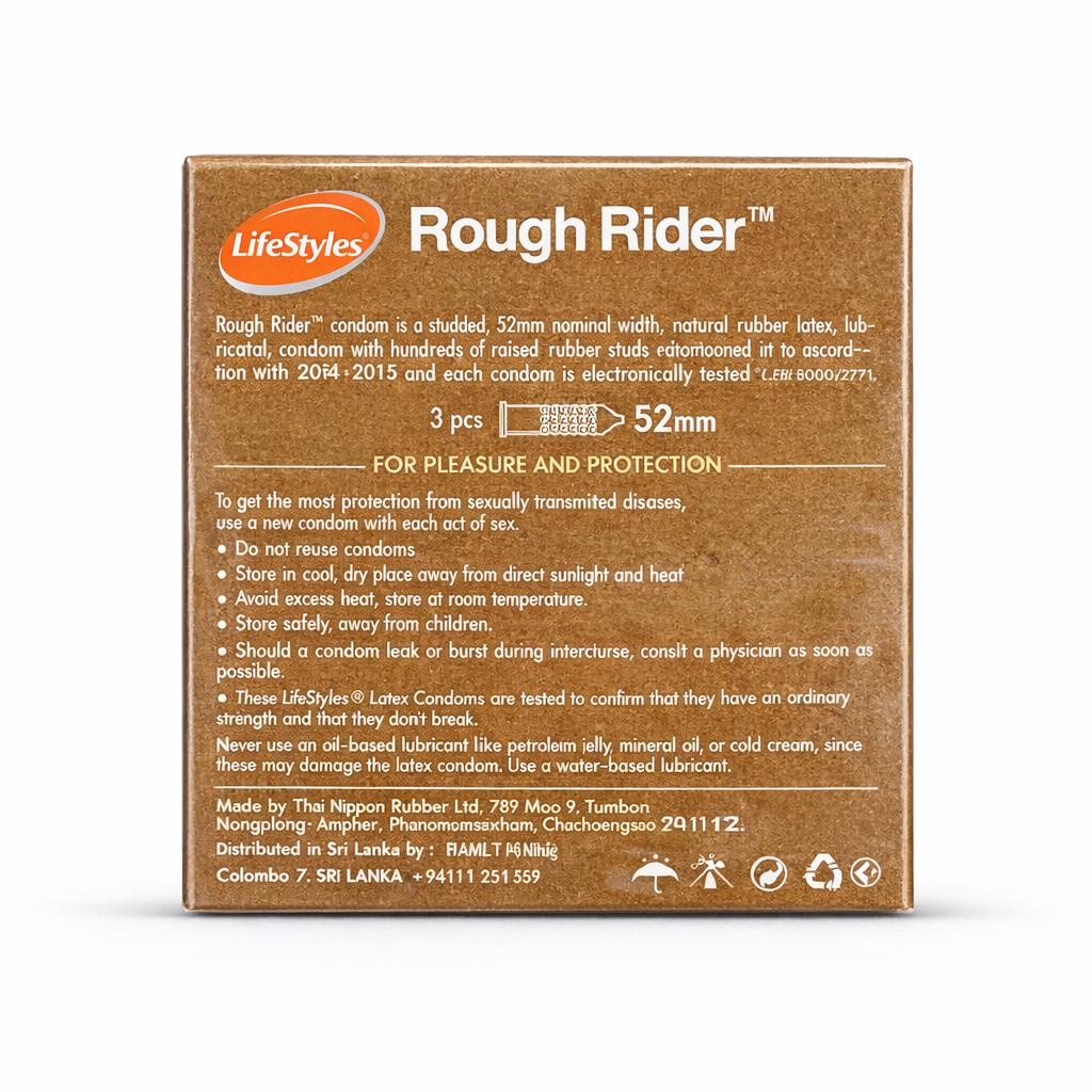 LifeStyles Rough Rider Condoms are specially designed for couples seeking enhanced sensation and reliable protection. Featuring a bold ribbed texture, these condoms are crafted to heighten stimulation and deliver a more exciting intimate experience. Made from premium-quality latex, LifeStyles Rough Rider Condoms provide effective protection against unwanted pregnancy while helping reduce the risk of sexually transmitted infections (STIs). The secure fit and smooth lubrication ensure comfort, durability, and confidence throughout intimacy. Trusted worldwide for quality and performance, these condoms are easy to use and suitable for regular sexual wellness routines. Whether you’re looking to add excitement or simply enjoy dependable protection, it offer the perfect balance of pleasure, safety, and comfort for satisfying intimate moments.