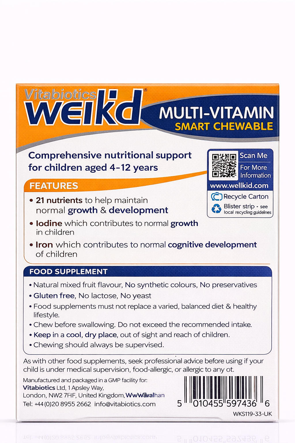 Vitabiotics Wellkid is a scientifically formulated multivitamin designed to support the healthy growth and development of children. Developed by Vitabiotics, this advanced formula provides essential vitamins and minerals to help maintain normal immune function, bone health, and cognitive development. Wellkid contains vitamin D to support strong bones and teeth, iron for normal cognitive function, and iodine to aid brain development. Vitamins A, C, and E provide antioxidant and immune support, while zinc contributes to normal growth and metabolism, ideal for daily use. Gentle on young stomachs and suitable for regular use, Vitabiotics Wellkid supports energy, concentration, and overall wellbeing, making it a trusted choice for parents who want balanced nutrition for their children.
