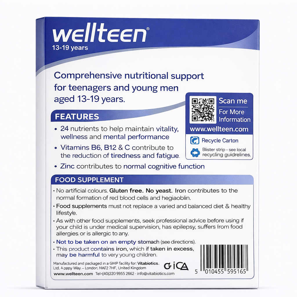 Vitabiotics Wellteen Him is a scientifically formulated multivitamin designed to support the nutritional needs of teenage boys during key years of growth and development. This advanced formula helps maintain energy levels, immune function, brain performance, and overall wellbeing. Enriched with essential vitamins and minerals including vitamin D, zinc, iron, iodine, and B-complex vitamins, Wellteen Him supports normal muscle function, cognitive development, and hormone balance. Antioxidants such as vitamins C and E help protect cells from oxidative stress, while magnesium and iron contribute to reduced tiredness and fatigue. Developed by Vitabiotics, this supplement is ideal for active teens, students, and young athletes who require reliable daily nutritional support.