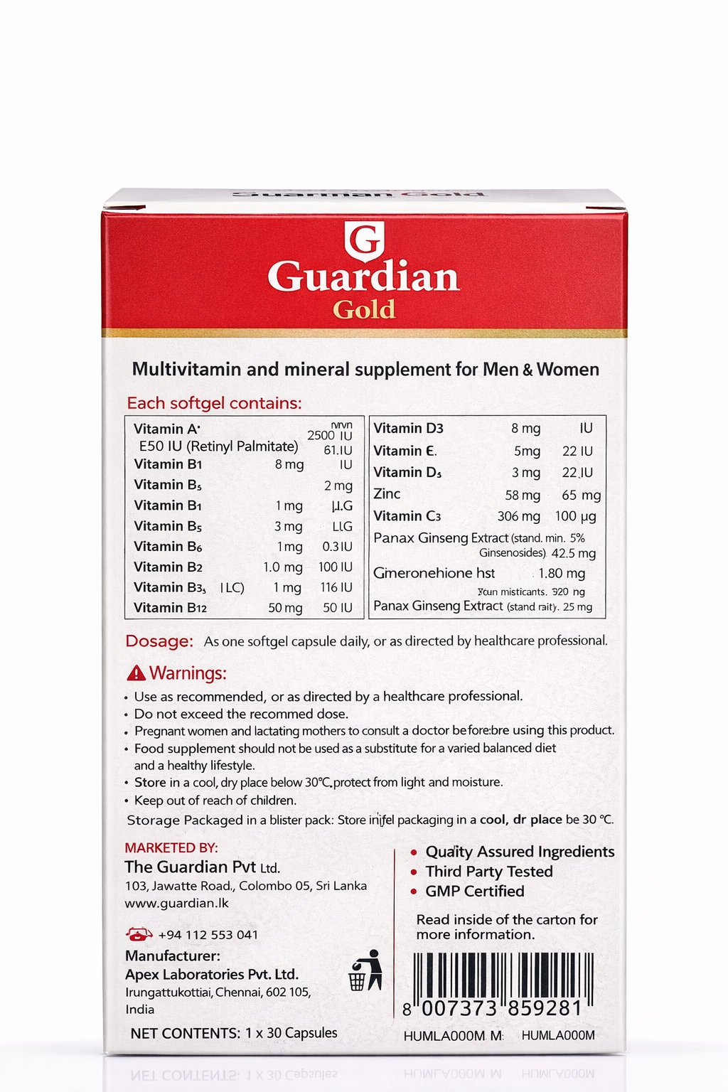 Guardian Gold Capsules are specially formulated to support overall health and wellbeing for both men and women. Enriched with essential vitamins, minerals, and antioxidants, this daily multivitamin helps improve energy levels, strengthen immunity, support heart and brain health, and maintain muscle strength.