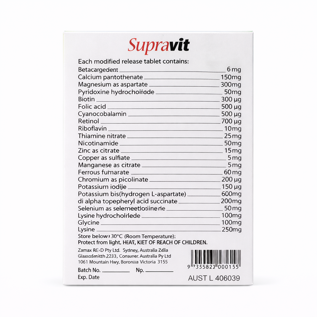 Supravit Multivitamin is a high-quality executive multivitamin and mineral formulation designed to support overall health, energy, and vitality. Its Advanced provides a balanced combination of essential vitamins, minerals, and trace elements to help meet daily nutritional requirements.